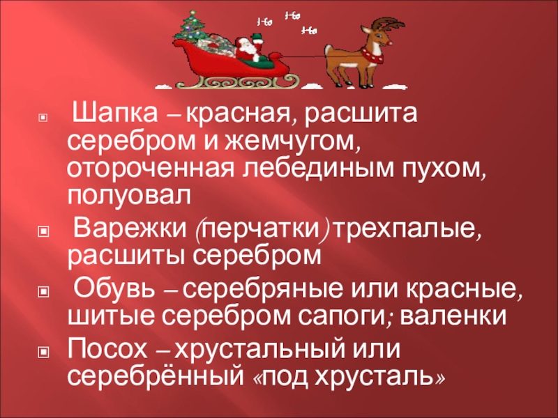Шапка – красная, расшита серебром и жемчугом, отороченная лебединым пухом, полуовал Варежки (перчатки) трехпалые, расшиты серебром