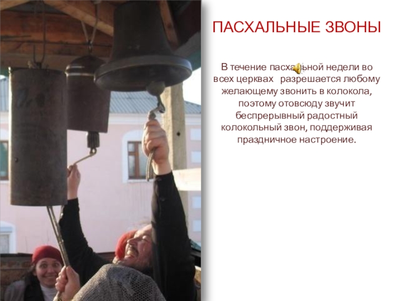 ПАСХАЛЬНЫЕ ЗВОНЫВ течение пасхальной недели во всех церквах  разрешается любому желающему звонить в колокола, поэтому отовсюду