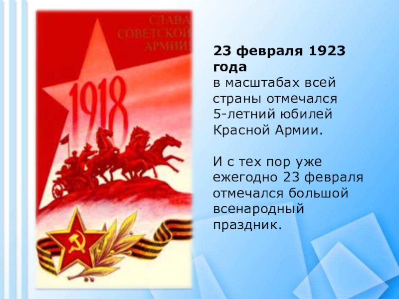 23 февраля 1923 года в масштабах всей страны отмечался 5-летний юбилей Красной Армии.И с тех пор уже