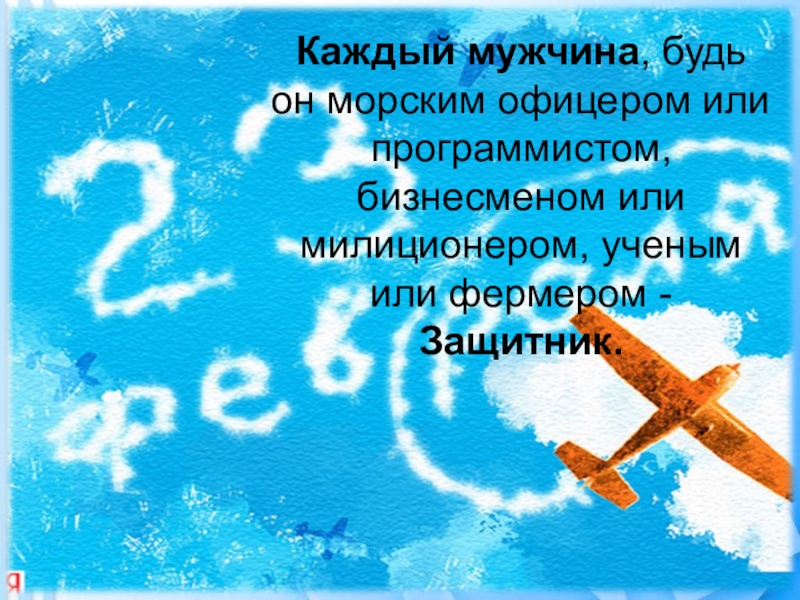 Каждый мужчина, будь он морским офицером или программистом, бизнесменом или милиционером, ученым или фермером - Защитник.