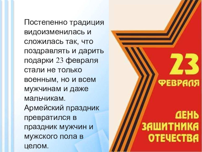 Постепенно традиция видоизменилась и сложилась так, что поздравлять и дарить подарки 23 февраля стали не только военным,