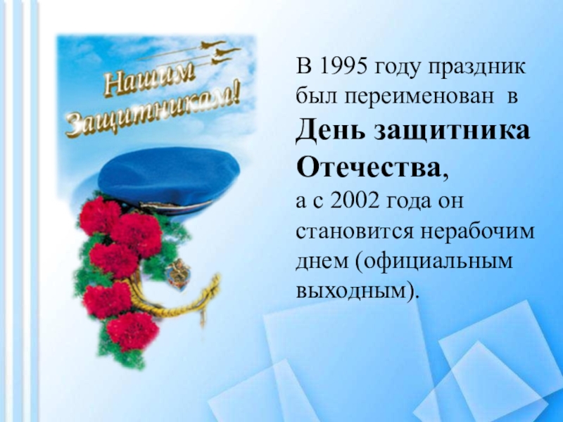 В 1995 году праздник был переименован  в День защитника Отечества, а с 2002 года он становится нерабочим днем