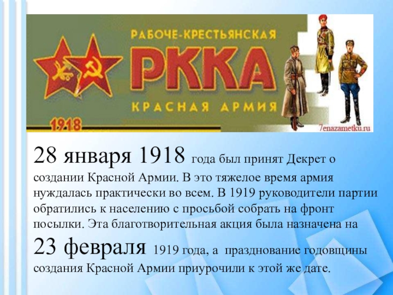 Слайд 628 января 1918 года был принят Декрет о создании Красной Армии.