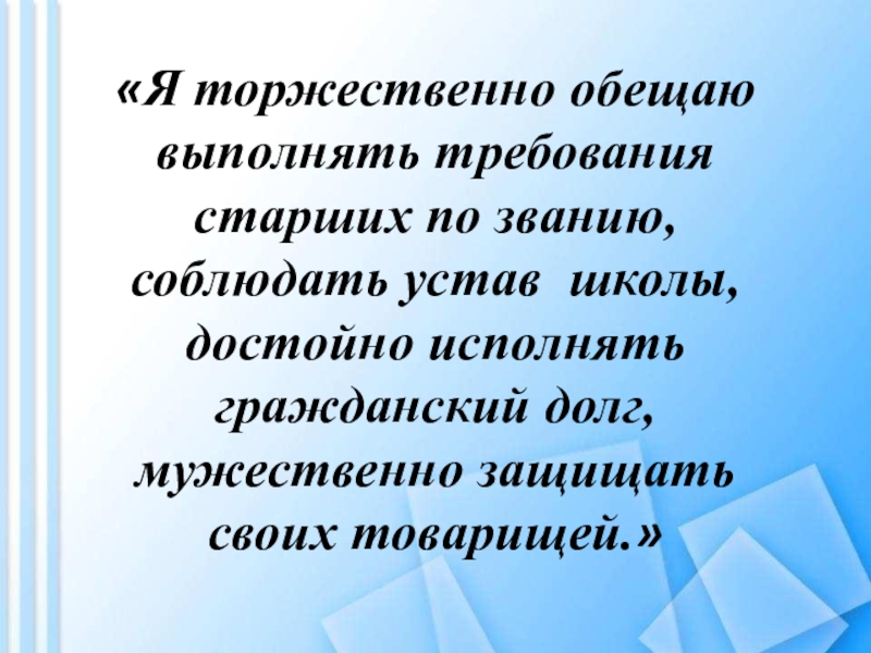 Слайд 20«Я торжественно обещаю выполнять требования старших по званию, соблюдать устав школы,