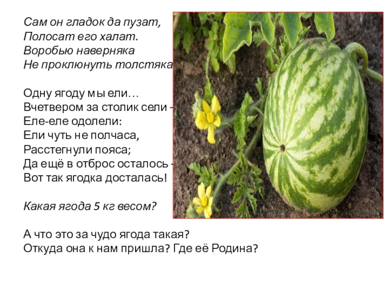 Сам он гладок да пузат,Полосат его халат.Воробью навернякаНе проклюнуть толстяка.Одну ягоду мы ели…Вчетвером за столик сели –Еле-еле одолели:Ели чуть не полчаса,Расстегнули пояса;Да ещё в отброс осталось –Вот так ягодка досталась!Какая ягода 5 кг весом?А что