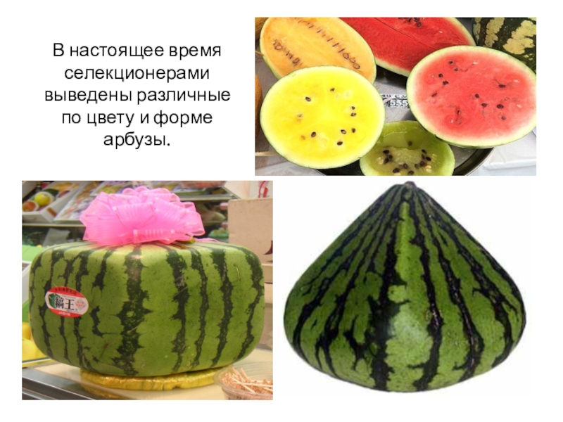 Слайд 6В настоящее время селекционерами выведены различные по цвету и форме арбузы.