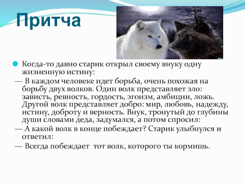 каждом человеке идет борьба, очень похожая на борьбу двух волков. Один волк представляет зло: зависть, ревность, гордость, эгоизм, амбиции, ложь. Другой волк представляет добро: мир, любовь, надежду, истину, доброту и верность. Внук, тронутый до глубины души словами деда, задумался, а потом спросил: