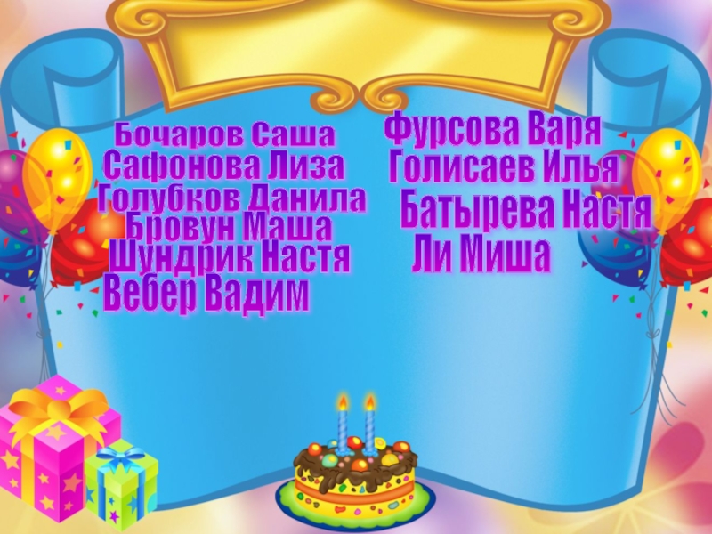 Бочаров СашаСафонова ЛизаГолубков ДанилаБровун МашаШундрик НастяВебер ВадимЛи МишаБатырева НастяФурсова ВаряГолисаев Илья