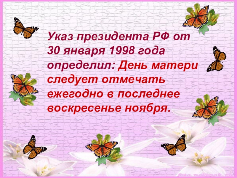 Слайд 3Указ президента РФ от 30 января 1998 года определил: День матери
