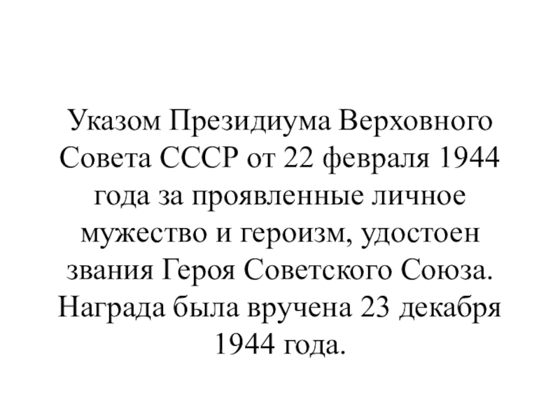 Слайд 12Указом Президиума Верховного Совета СССР от 22 февраля 1944 года за