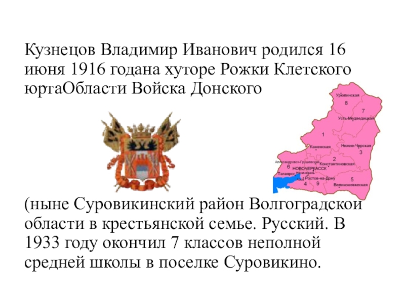 Кузнецов Владимир Иванович родился 16 июня 1916 годана хуторе Рожки Клетского