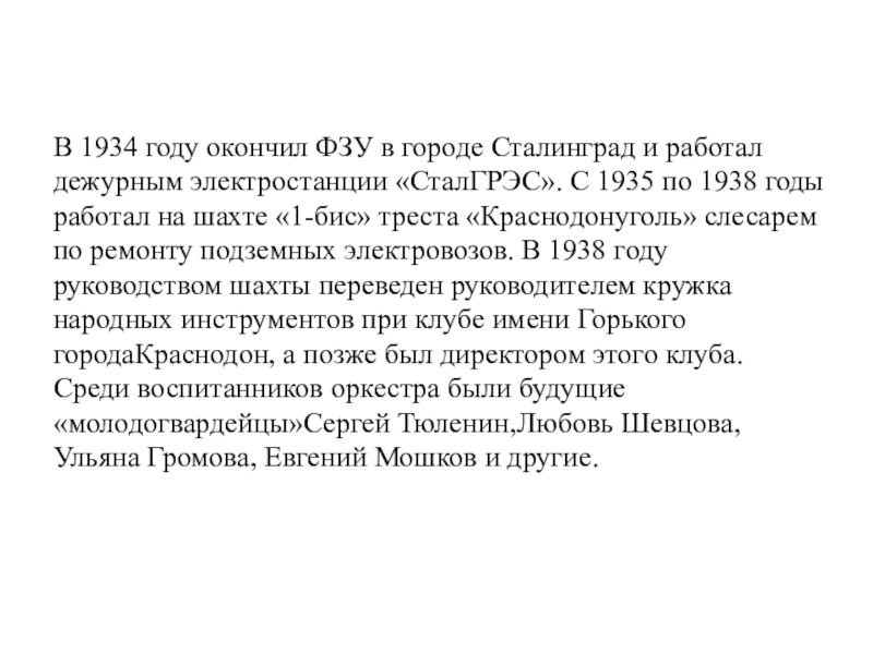 Слайд 4В 1934 году окончил ФЗУ в городе Сталинград и работал дежурным