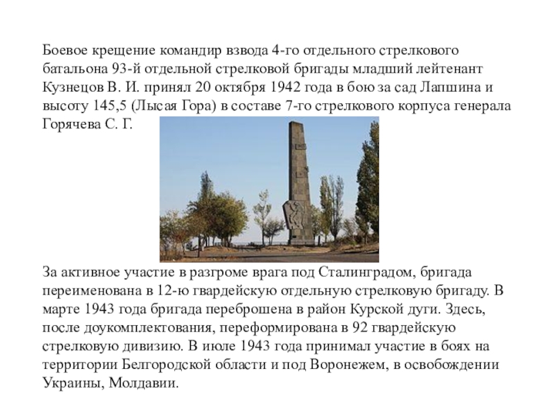 бригады младший лейтенант Кузнецов В. И. принял 20 октября 1942 года в бою за сад Лапшина и высоту 145,5 (Лысая Гора) в составе 7-го стрелкового корпуса генерала Горячева С. Г.