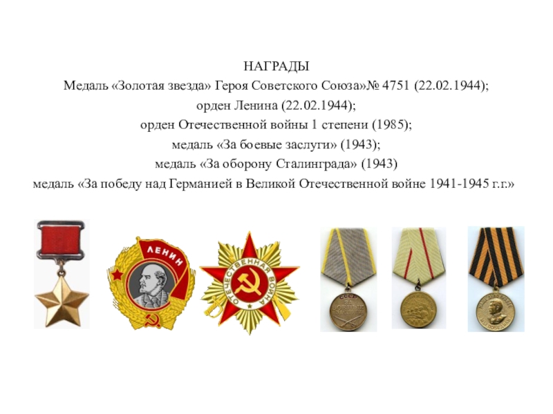 Медаль «Золотая звезда» Героя Советского Союза»№ 4751 (22.02.1944);