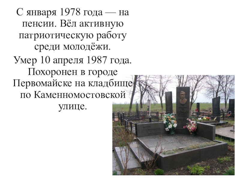 Слайд 11С января 1978 года — на пенсии. Вёл активную патриотическую работу среди