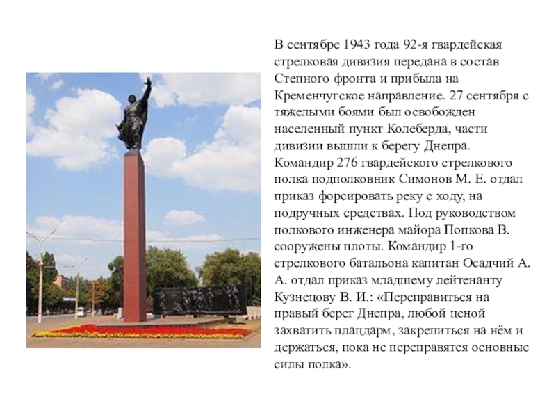Степного фронта и прибыла на Кременчугское направление. 27 сентября с тяжелыми боями был освобожден населенный пункт Колеберда, части дивизии вышли к берегу Днепра. Командир 276 гвардейского стрелкового полка подполковник Симонов М. Е. отдал приказ форсировать реку с ходу, на подручных средствах. Под руководством полкового инженера майора Попкова В. сооружены плоты. Командир 1-го стрелкового батальона капитан Осадчий А. А. отдал приказ младшему лейтенанту Кузнецову В. И.: «Переправиться на правый берег Днепра, любой ценой захватить плацдарм, закрепиться на нём и держаться, пока не переправятся основные силы полка».
