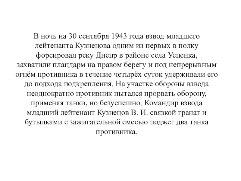 захватили плацдарм на правом берегу и под непрерывным огнём противника в течение четырёх суток удерживали его до подхода подкрепления. На участке обороны взвода неоднократно противник пытался прорвать оборону, применяя танки, но безуспешно. Командир взвода младший лейтенант Кузнецов В. И. связкой гранат и бутылками с зажигательной смесью поджег два танка противника.