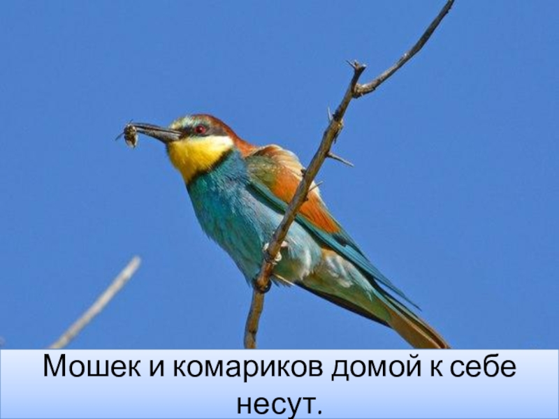 Слайд 7Мошек и комариков домой к себе несут.