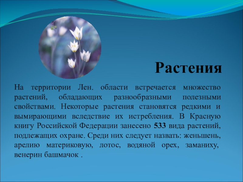РастенияНа территории Лен. области встречается множество растений, обладающих разнообразными полезными свойствами. Некоторые растения становятся редкими и вымирающими