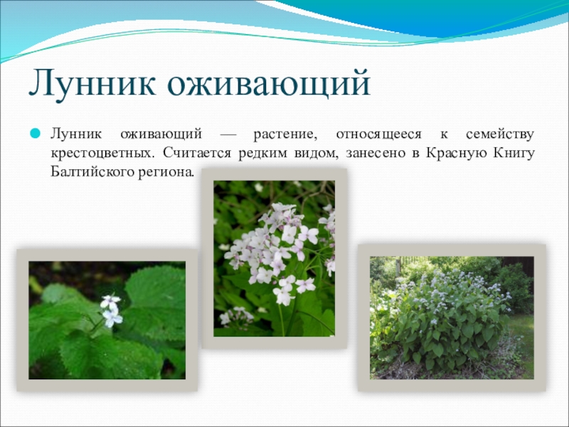 Лунник оживающийЛунник оживающий — растение, относящееся к семейству крестоцветных. Считается редким видом, занесено в Красную Книгу Балтийского
