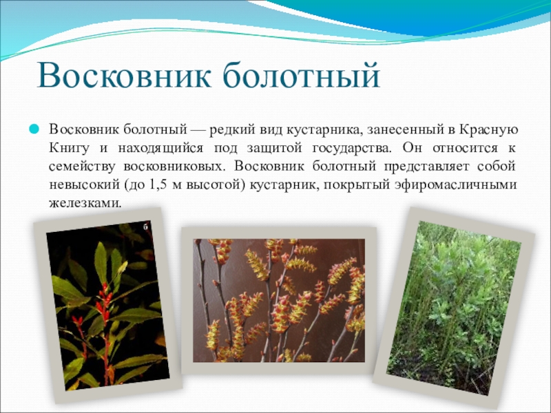 и находящийся под защитой государства. Он относится к семейству восковниковых. Восковник болотный представляет собой невысокий (до 1,5 м высотой) кустарник, покрытый эфиромасличными железками.