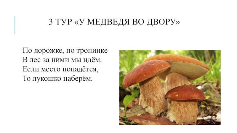 3 тур «У медведя во двору»По дорожке, по тропинкеВ лес за ними мы идём.Если место попадётся,То лукошко