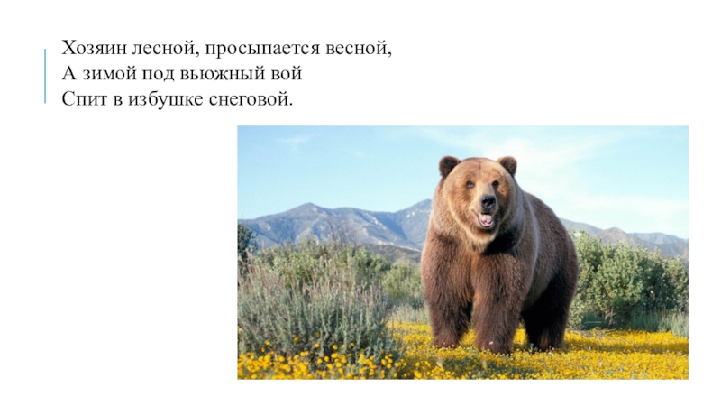 Хозяин лесной, просыпается весной,А зимой под вьюжный вой  Спит в избушке снеговой.