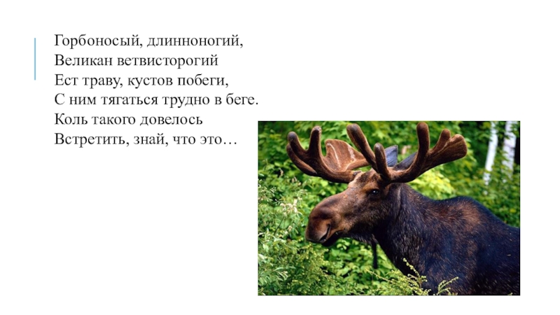 Горбоносый, длинноногий,Великан ветвисторогийЕст траву, кустов побеги,С ним тягаться трудно в беге.Коль такого довелосьВстретить, знай, что это…