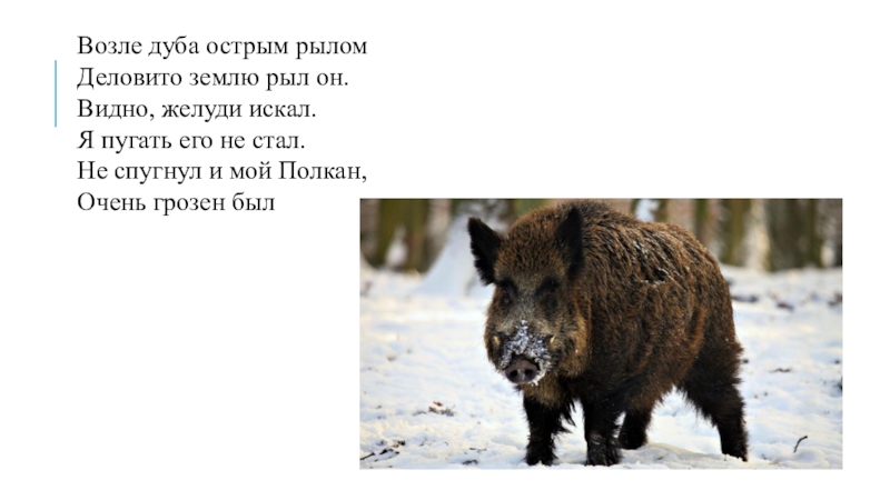 Возле дуба острым рыломДеловито землю рыл он.Видно, желуди искал.Я пугать его не стал.Не спугнул и мой Полкан,Очень