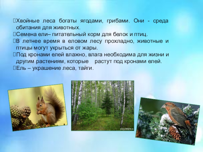 Хвойные леса богаты ягодами, грибами. Они - среда обитания для животных.Семена ели– питательный корм для белок и птиц.В летнее время в еловом лесу прохладно, животные и птицы могут укрыться от жары.Под кронами елей влажно, влага необходима