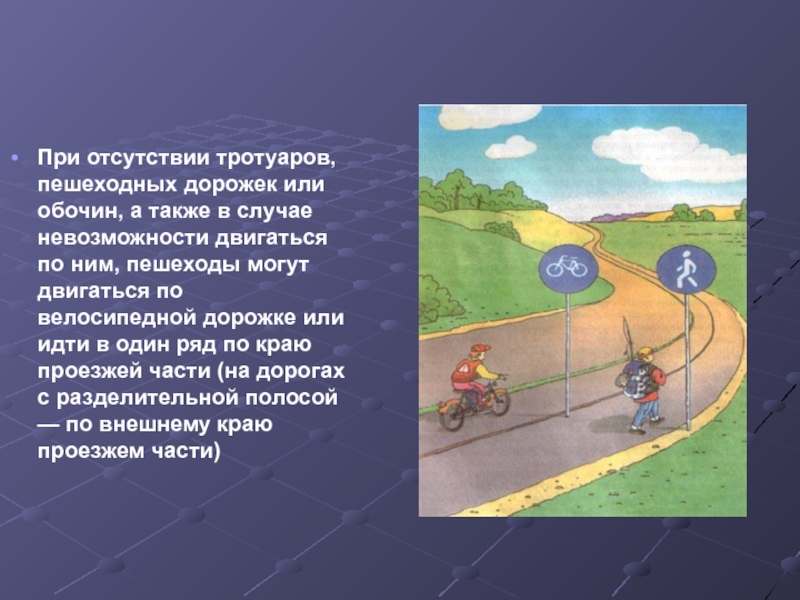 невозможности двигаться по ним, пешеходы могут двигаться по велосипедной дорожке или идти в один ряд по краю проезжей части (на дорогах с разделительной полосой — по внешнему краю проезжем части)