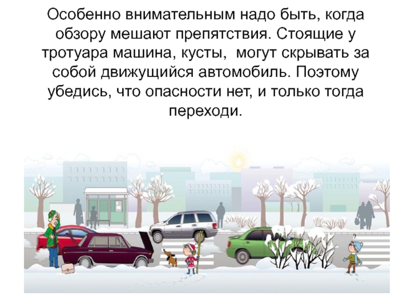 Слайд 31Особенно внимательным надо быть, когда обзору мешают препятствия. Стоящие у тротуара