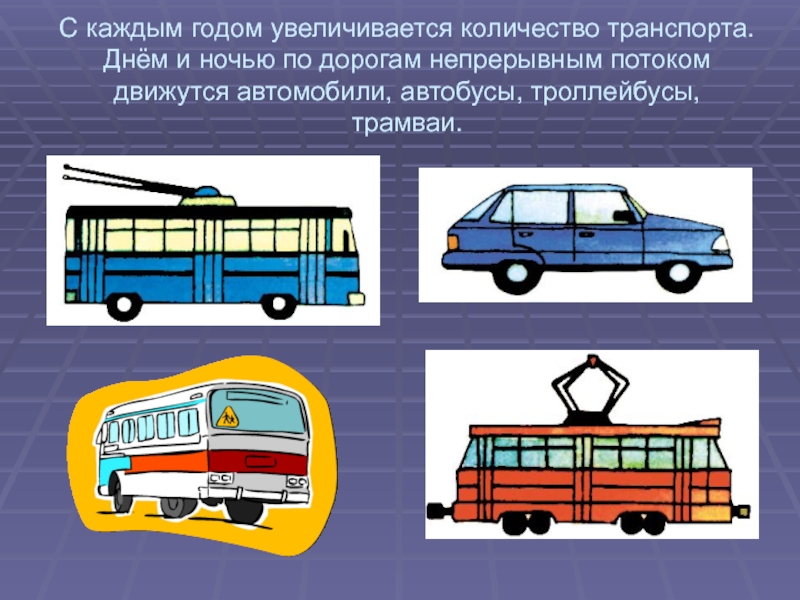Слайд 2С каждым годом увеличивается количество транспорта. Днём и ночью по дорогам