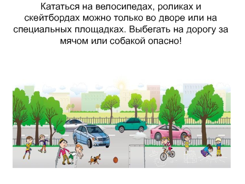 Слайд 26Кататься на велосипедах, роликах и скейтбордах можно только во дворе или