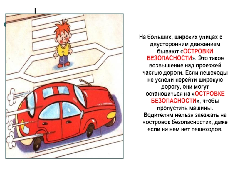такое возвышение над проезжей частью дороги. Если пешеходы не успели перейти широкую дорогу, они могут остановиться на «ОСТРОВКЕ БЕЗОПАСНОСТИ», чтобы пропустить машины. Водителям нельзя заезжать на «островок безопасности», даже если на нем нет пешеходов.