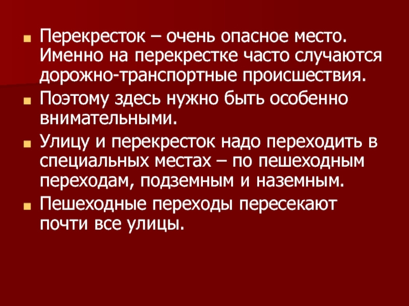 Слайд 22Перекресток – очень опасное место. Именно на перекрестке часто случаются дорожно-транспортные