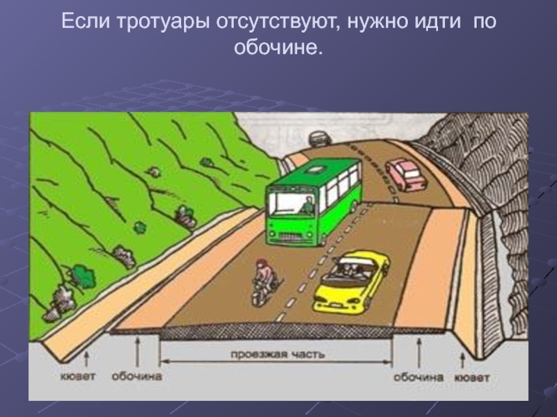 Слайд 16Если тротуары отсутствуют, нужно идти по обочине.