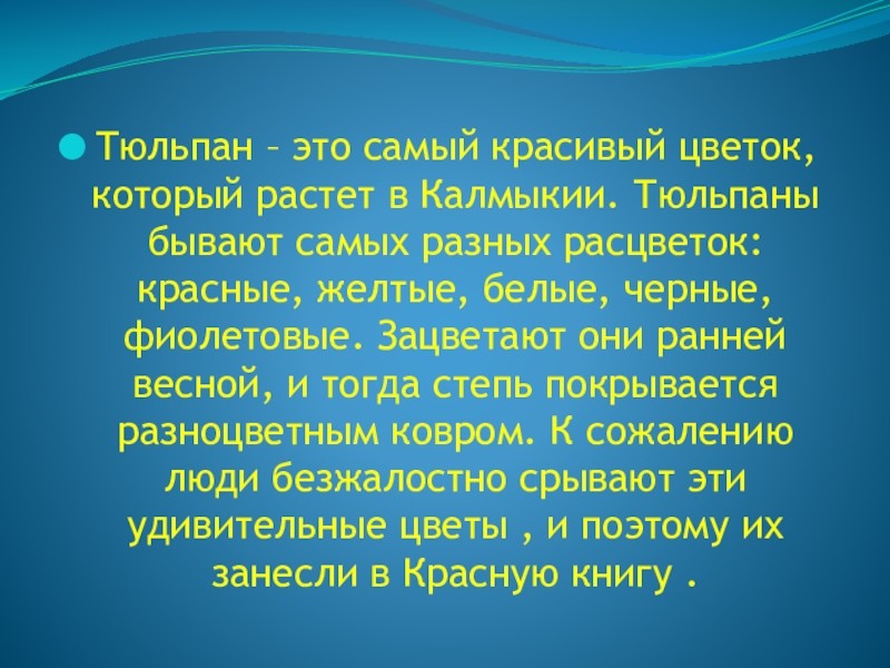 Слайд 4Тюльпан – это самый красивый цветок, который растет в Калмыкии. Тюльпаны