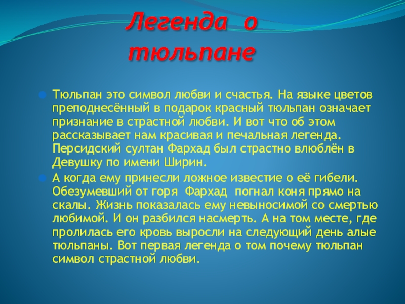 А когда ему принесли ложное известие о её гибели. Обезумевший от горя Фархад погнал коня прямо на скалы. Жизнь показалась ему невыносимой со смертью любимой. И он разбился насмерть. А на том месте, где пролилась его кровь выросли на следующий день алые тюльпаны. Вот первая легенда о том почему тюльпан символ страстной любви.