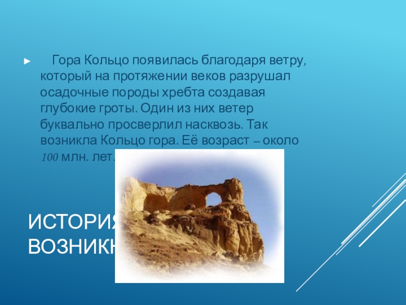 веков разрушал осадочные породы хребта создавая глубокие гроты. Один из них ветер буквально просверлил насквозь. Так возникла Кольцо гора. Её возраст – около 100 млн. лет.