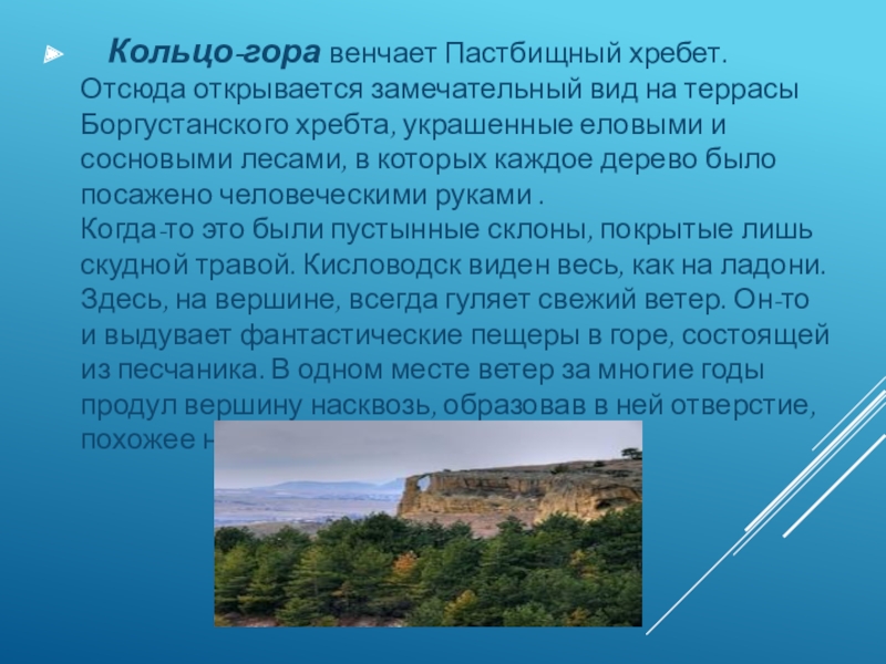 Слайд 3 Кольцо-гора венчает Пастбищный хребет. Отсюда открывается замечательный вид на террасы