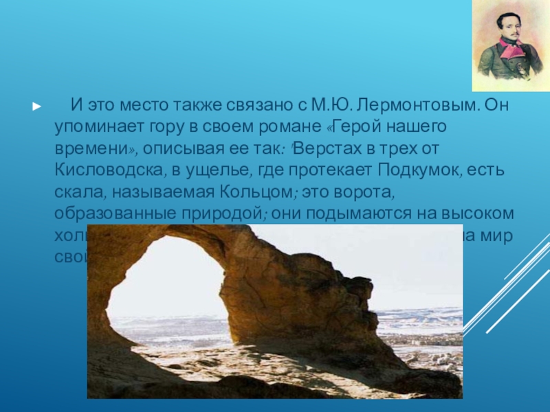 упоминает гору в своем романе «Герой нашего времени», описывая ее так: "Верстах в трех от Кисловодска, в ущелье, где протекает Подкумок, есть скала, называемая Кольцом; это ворота, образованные природой; они подымаются на высоком холме, и заходящее солнце сквозь них бросает на мир свой последний пламенный взгляд".