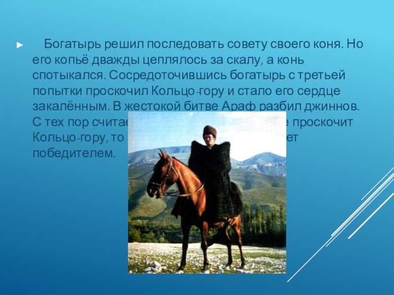 Слайд 7 Богатырь решил последовать совету своего коня. Но его копьё