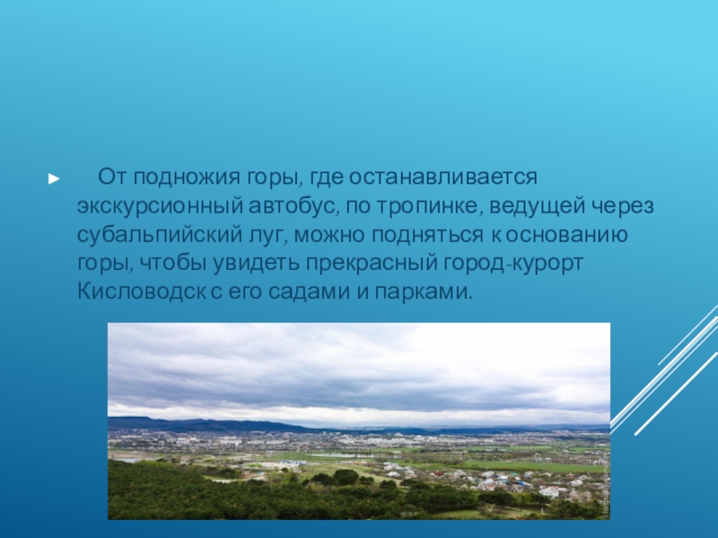 ведущей через субальпийский луг, можно подняться к основанию горы, чтобы увидеть прекрасный город-курорт Кисловодск с его садами и парками.