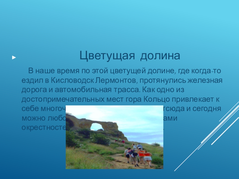 В наше время по этой цветущей долине, где когда-то ездил в Кисловодск Лермонтов, протянулись железная дорога и автомобильная трасса. Как одно из достопримечательных мест гора Кольцо привлекает к себе многочисленных экскурсантов. Отсюда и сегодня можно любоваться красивейшими видами окрестностей, воспетых Лермонтовым.