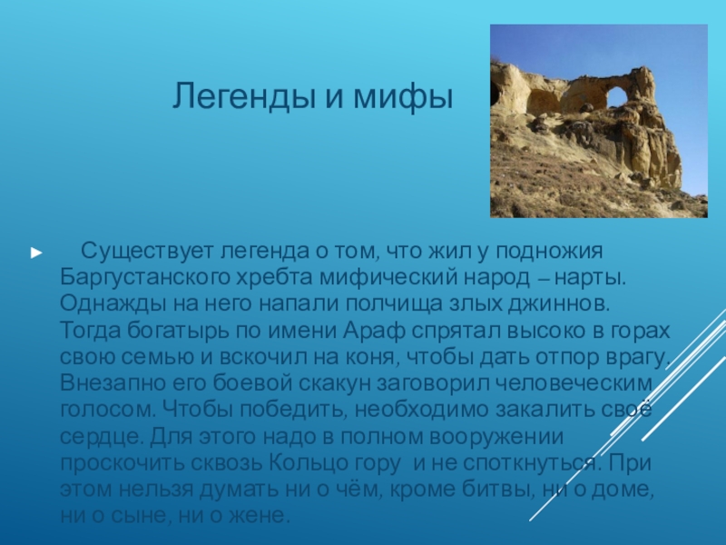 Существует легенда о том, что жил у подножия Баргустанского хребта мифический народ – нарты. Однажды на него напали полчища злых джиннов. Тогда богатырь по имени Араф спрятал высоко в горах свою семью и вскочил на коня, чтобы дать отпор врагу. Внезапно его боевой скакун заговорил человеческим голосом. Чтобы победить, необходимо закалить своё сердце. Для этого надо в полном вооружении проскочить сквозь Кольцо гору и не споткнуться. При этом нельзя думать ни о чём, кроме битвы, ни о доме, ни о сыне, ни о жене.
