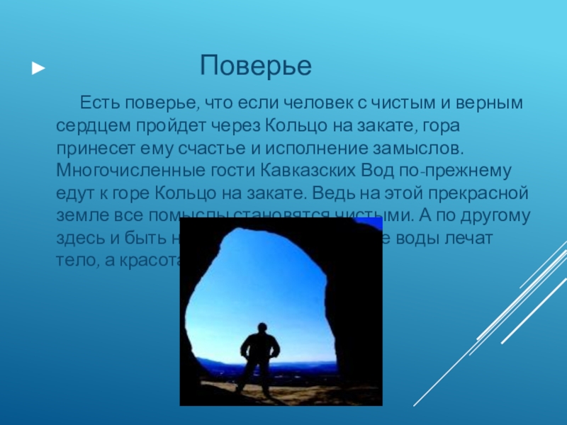 Есть поверье, что если человек с чистым и верным сердцем пройдет через Кольцо на закате, гора принесет ему счастье и исполнение замыслов. Многочисленные гости Кавказских Вод по-прежнему едут к горе Кольцо на закате. Ведь на этой прекрасной земле все помыслы становятся чистыми. А по другому здесь и быть не может, ведь целебные воды лечат тело, а красота – душу.