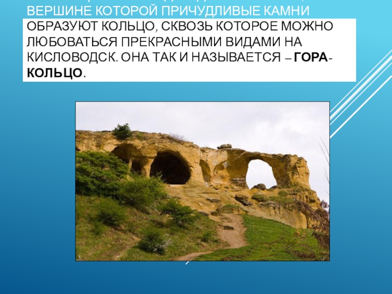Когда-то это были пустынные склоны, покрытые лишь скудной травой. Кисловодск виден весь, как на ладони. Здесь, на вершине, всегда гуляет свежий ветер. Он-то и выдувает фантастические пещеры в горе, состоящей из песчаника. В одном месте ветер за многие годы продул вершину насквозь, образовав в ней отверстие, похожее на кольцо.
