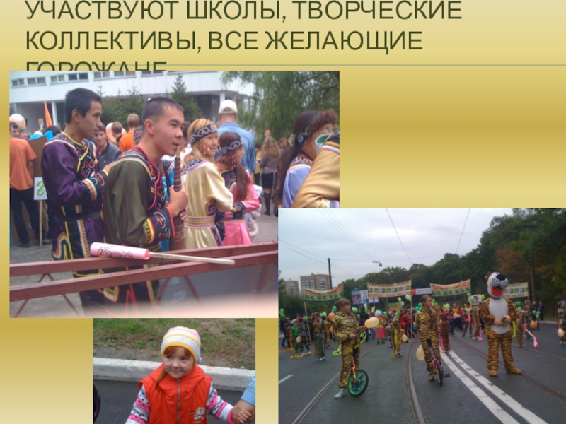 Слайд 8УЧАСТВУЮТ ШКОЛЫ, ТВОРЧЕСКИЕ КОЛЛЕКТИВЫ, ВСЕ ЖЕЛАЮЩИЕ ГОРОЖАНЕ