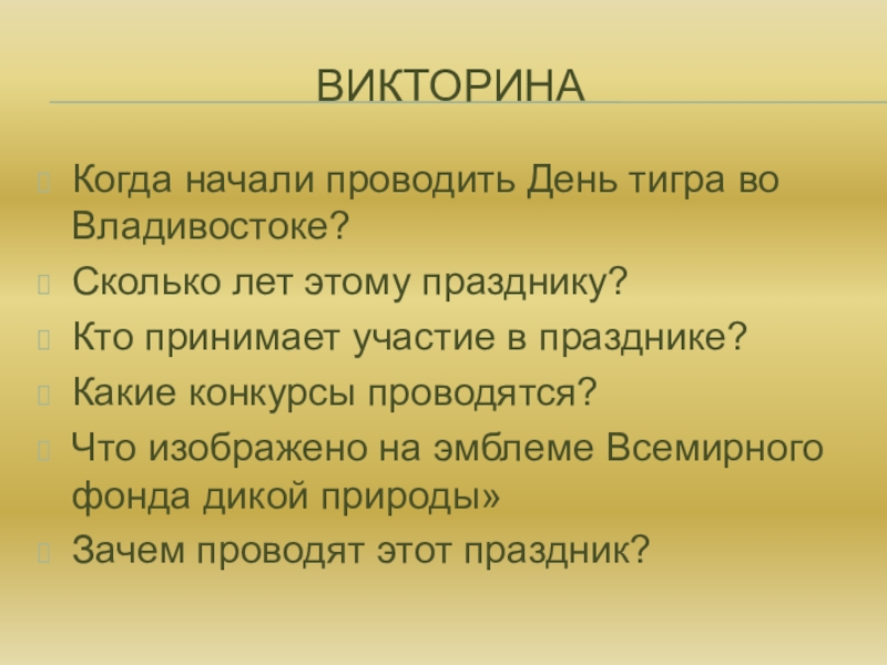 ВИКТОРИНА Когда начали проводить День тигра во Владивостоке?Сколько лет этому празднику?Кто принимает участие в празднике?Какие конкурсы проводятся?Что